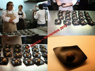 Nos explico como había realizado este bocado, que en un principio nos iba confundir, ya que in-mente tendríamos un bocado dulce, pero el bombón estaba relleno con un puré de garbanzos, cerrado en un bombón de cobertura negra y polvo de kikos, así que el contraste es curioso entre el saldo del puré de garbanzos y los Kikos, para al final, una vez que la cobertura negra se ha fundido con la temperatura de la boca, nos crea un paisaje de cacao y agradable persistencia en boca.Terminada la presentación del primer aperitivo vino el segundo de la mano de Mikel Fiestras del Restaurante La Huerta, Una copa de boletus y otras cosillas,
