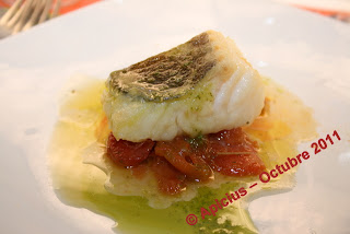 Aspecto del plato a la vista del comensal. Tanto la textura del tomate como del bacalao en su punto justo, el bacalao jugoso y en su punto. Solo le pongo un pero a este preparado, tal vez un poco de exceso de albahaca.Con el bacalao y tomates asados se sirvió una Rioja Blanco del 2009 de las Bodegas Amaren, este vino ha sido fermentado en barricas nuevas de roble francés y procede de uvas Viura 80% y Malvasía 20%, su envejecimiento es de 7 meses y medio. Vino de color amarillo pajizo, muy aromático. En boca es suave con toque cítricos de corteza de limón